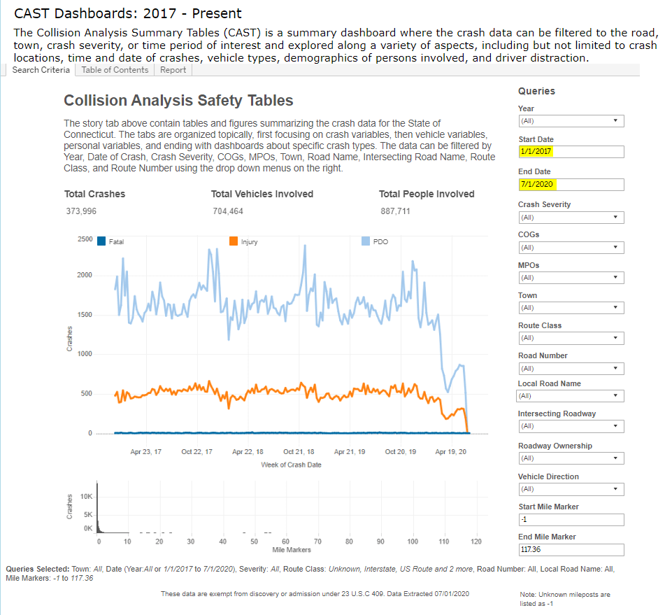 The Connecticut Crash Data Repository (CTCDR) CAST and Crash Emphasis Dashboards were recently updated to include motor vehicle crash data from January 1, 2017 to July 1, 2020.